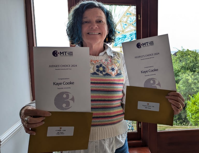 I was both the Judges' and People's choice winner of the Teesside University Three Minute Thesis competition (3MT) in 2024. The challenge was to present my PhD thesis in no more than three minutes and I went on to become a national semi-finalist in the competition.